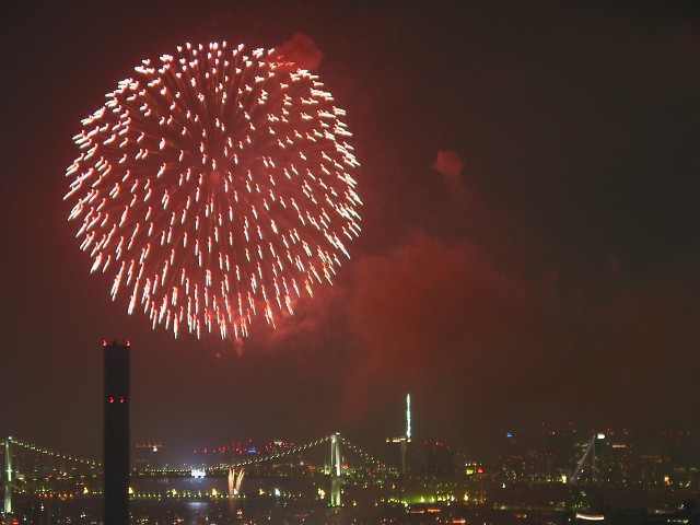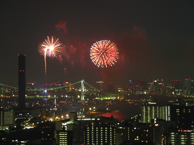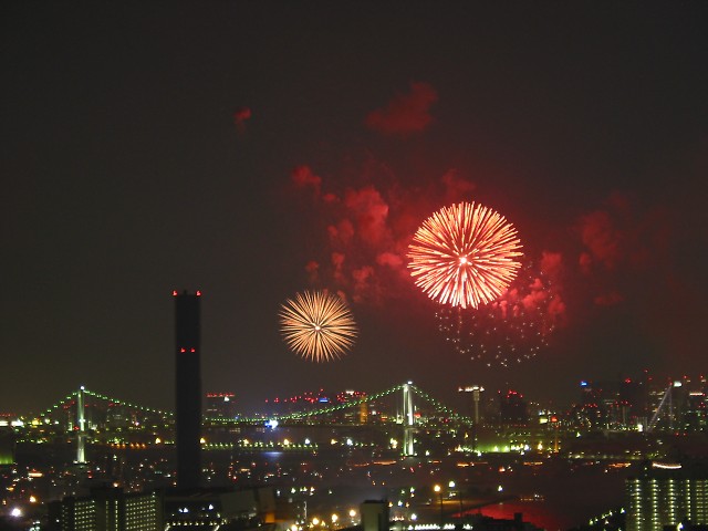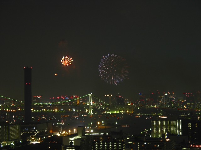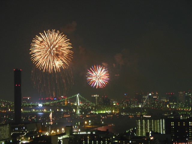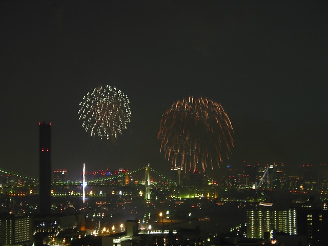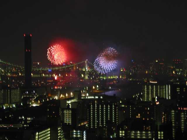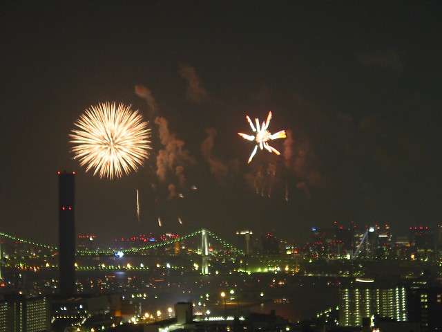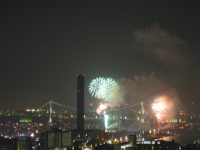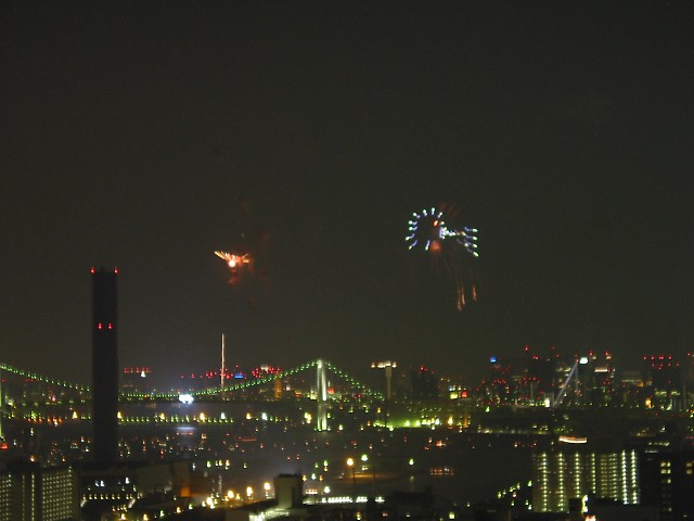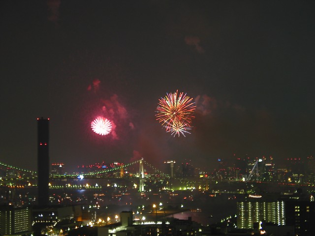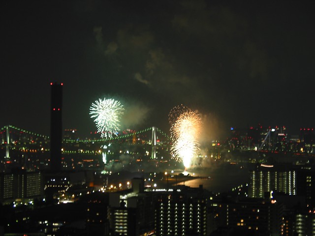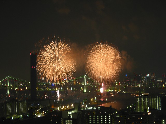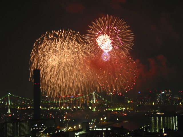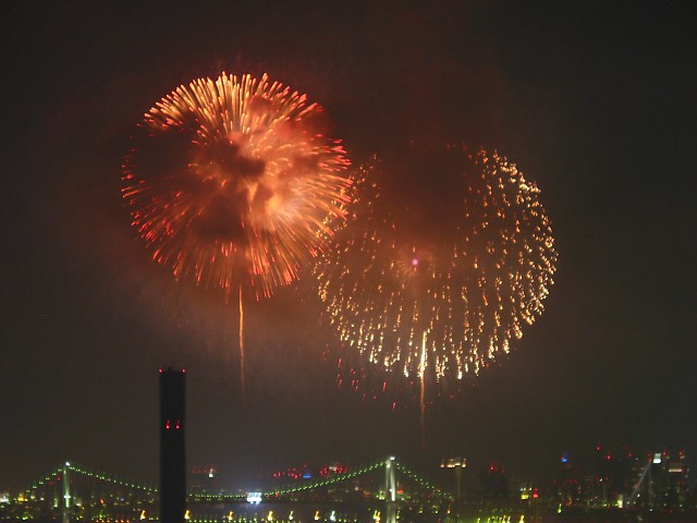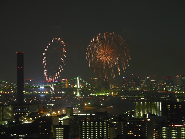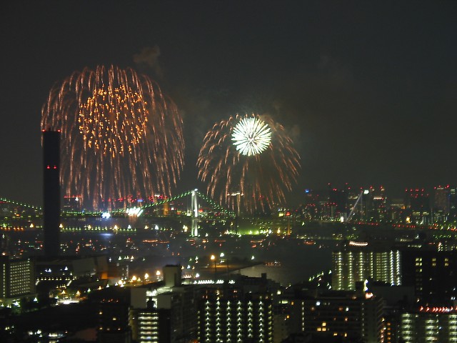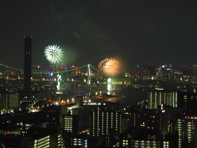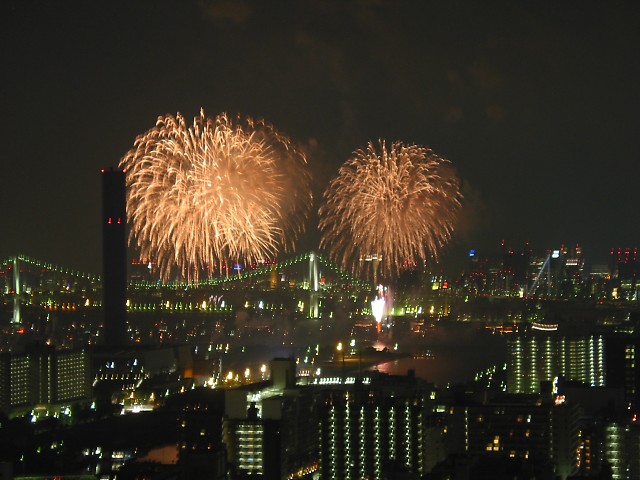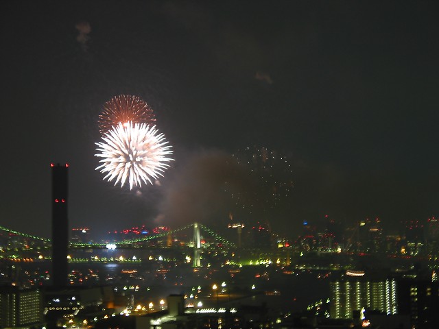 「第20回東京湾大華火祭」(同実行委員会、中央区主催、朝日新聞社など後援)が、2007年8月11日(土)に開催された。約35人の見物客は、狭い部屋に寿司詰め状態で、都心では最大級となる尺五寸玉(直径約45センチ)など約1万2000発の光と音の風物詩を楽しんだ。(c) Reuters 2008