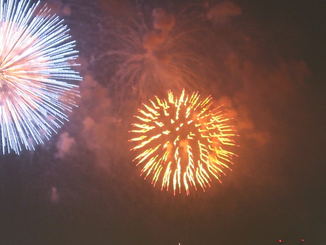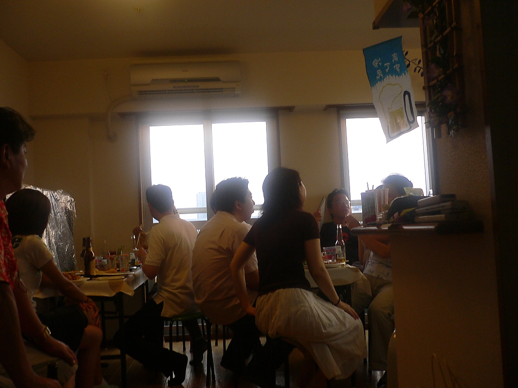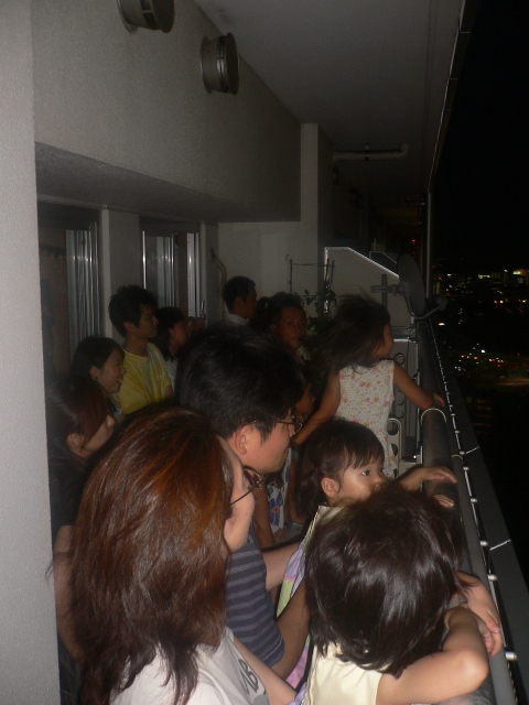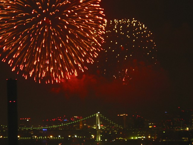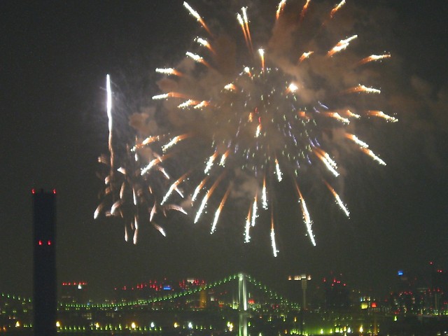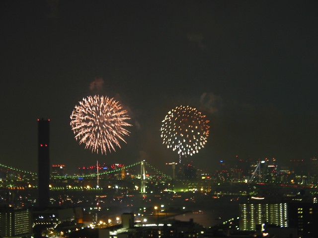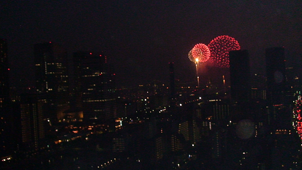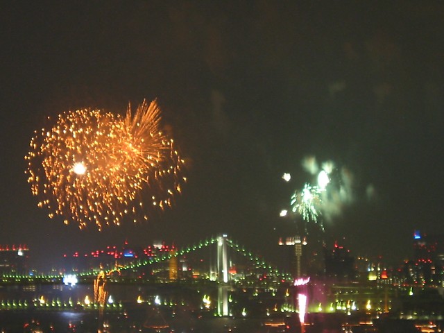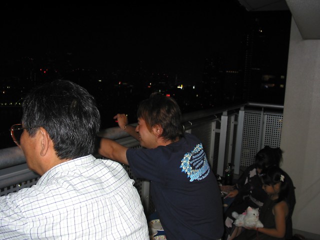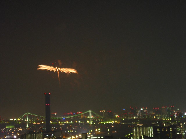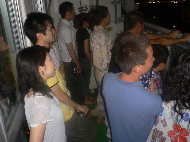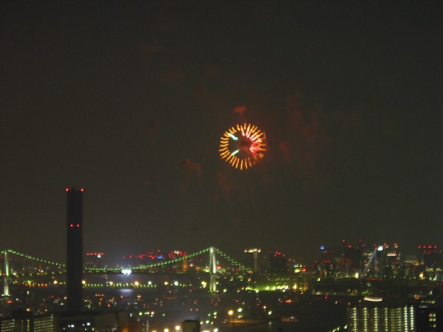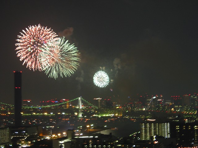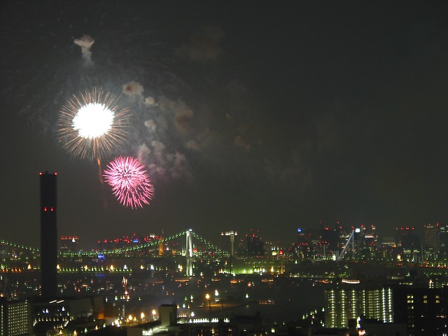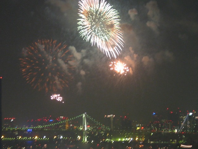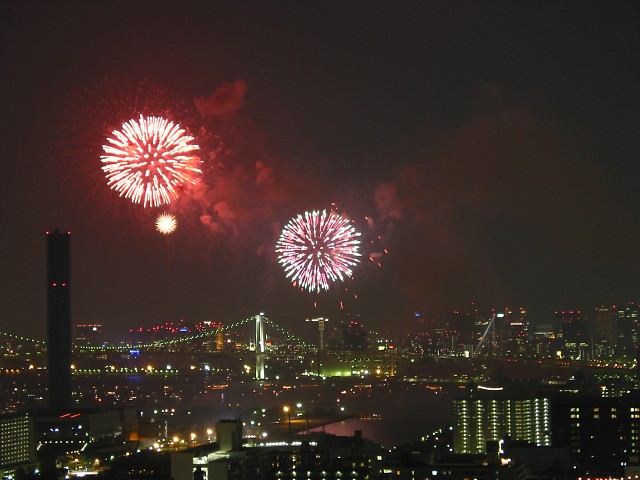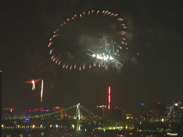 「第20回東京湾大華火祭」(同実行委員会、中央区主催、朝日新聞社など後援)が、2007年8月11日(土)に開催された。約35人の見物客は、狭い部屋に寿司詰め状態で、都心では最大級となる尺五寸玉(直径約45センチ)など約1万2000発の光と音の風物詩を楽しんだ。(c) Reuters 2008